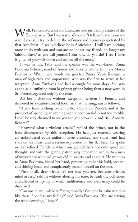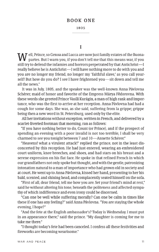 Below on the left, the first page of War and Peace using a traditional font. On the right, the first page of War and Peace using a Sustainable Typesetting®font.