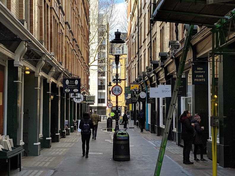 I arrived to London before the Fair, to adjust to the jet lag prior to commencing the three busy days at the Olympia. To pass the time in a literary way on the day before the Fair, I visited Cecil Court. This tiny, one-block street in Central London is known as the city’s – and perhaps the world’s – best collection of antique book dealers, print makers, and more. Photos are below, and a much better researched and detailed overview is available on Atlas Obscura, but suffice it to say that any book lover’s visit to London should include a brief stop by this Diagon Alley of literature.