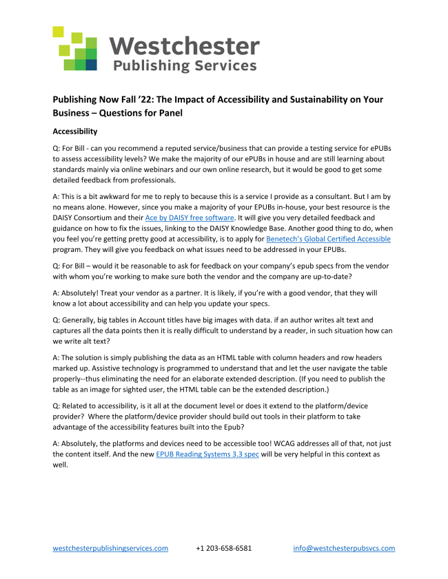 On Thursday, September 29, 2022, Publishers Weekly and Westchester Publishing Services co-hosted the webinar, Publishing Now ’22: Impact of Accessibility and Sustainability on Your Business. Moderated by Jim Milliot, Vice President and Editorial Director of Publishers Weekly, the panelists discussed substantive ways to improve accessibility and sustainability within individual businesses and throughout the publishing industry.